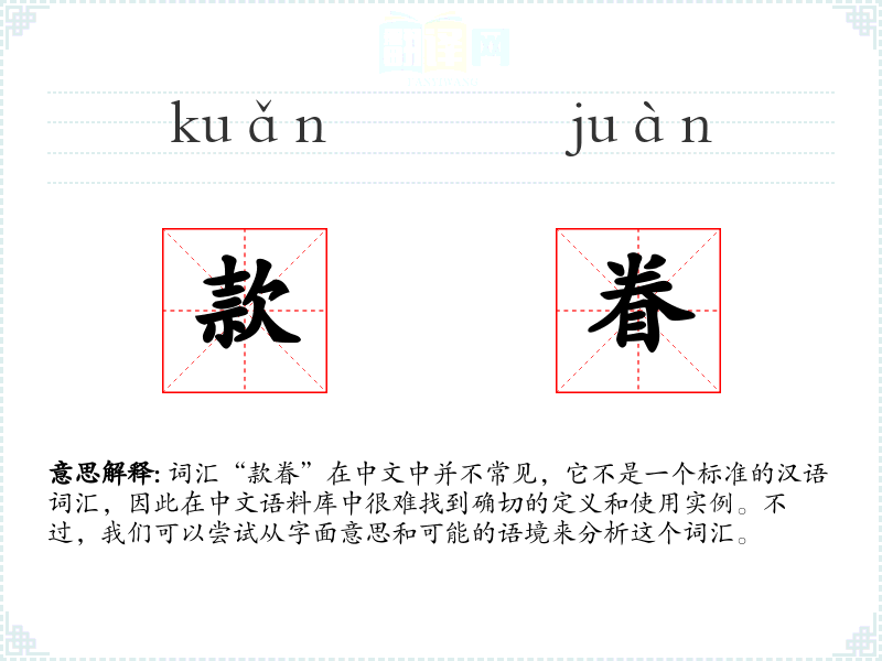 词汇“款眷”在中文中并不常见,它不是一个标准的汉语词汇,因此在中文语料库中很难找到确切的定义和使用实例。不过,我们可以尝试从字面意思和可能的语境来分析这个词汇。