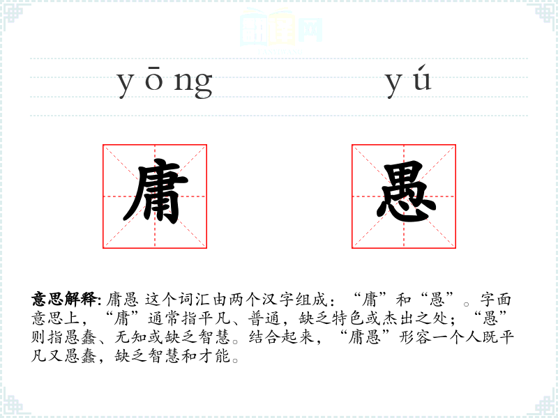 “庸”字最早见于《说文解字》,原意为用,后引申为平常、普通。“愚”字则源自古代对愚蠢、无知的描述。随着语言的发展,“庸愚”逐渐被用来形容人的品质,特别是在文学和日常语言中。