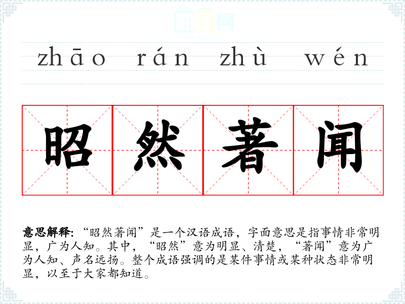 在英语中,类似的表达可能是“widely known”或“clearly evident”,但这些表达没有“昭然著闻”这个成语所蕴含的深刻文化内涵和历史背景。