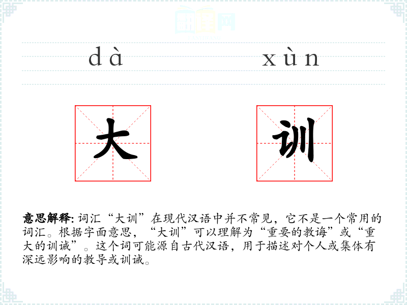 - 理解:“大训”是一个强调教诲重要性的词汇,虽然在现代汉语中不常用,但在某些正式或庄重的场合仍具有一定的使用价值。
