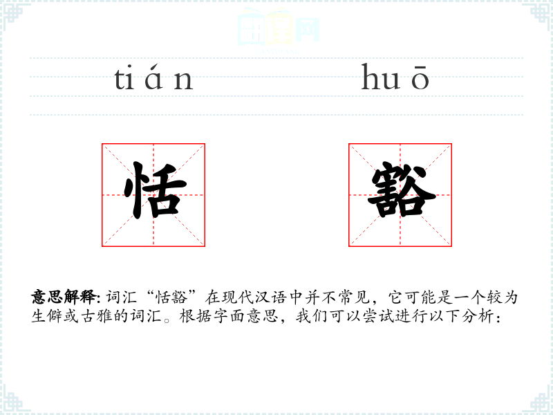 词汇“恬豁”在现代汉语中并不常见,它可能是一个较为生僻或古雅的词汇。根据字面意思,我们可以尝试进行以下分析:
