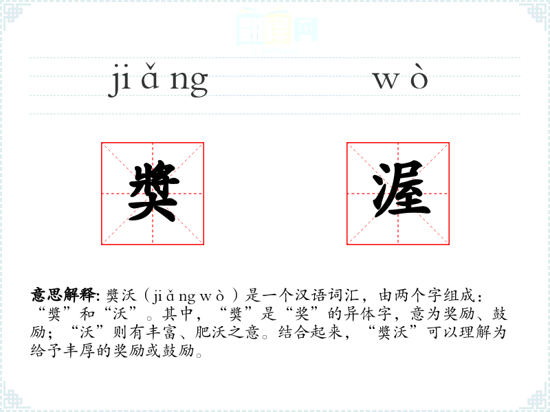 奬沃(jiǎng wò)是一个汉语词汇,由两个字组成:“奬”和“沃”。其中,“奬”是“奖”的异体字,意为奖励、鼓励;“沃”则有丰富、肥沃之意。结合起来,“奬沃”可以理解为给予丰厚的奖励或鼓励。