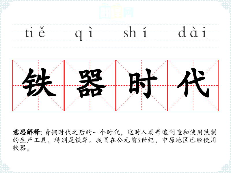 青铜时代之后的一个时代,这时人类普遍制造和使用铁制的生产工具,特别是铁犁。我国在公元前5世纪,中原地区已经使用铁器。