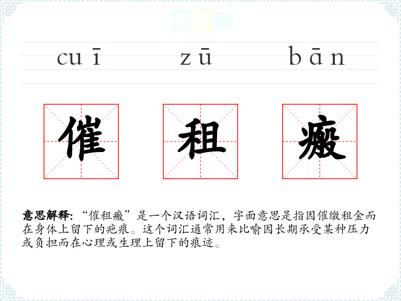 “催租瘢”是一个汉语词汇,字面意思是指因催缴租金而在身体上留下的疤痕。这个词汇通常用来比喻因长期承受某种压力或负担而在心理或生理上留下的痕迹。
