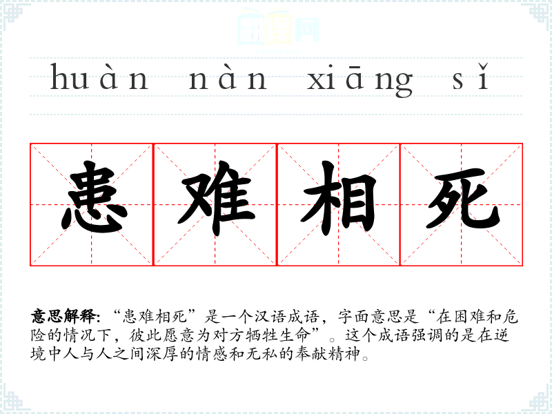 “患难相死”是一个汉语成语,字面意思是“在困难和危险的情况下,彼此愿意为对方牺牲生命”。这个成语强调的是在逆境中人与人之间深厚的情感和无私的奉献精神。