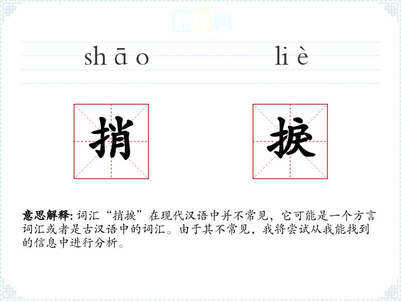 词汇“捎捩”在现代汉语中并不常见,它可能是一个方言词汇或者是古汉语中的词汇。由于其不常见,我将尝试从我能找到的信息中进行分析。