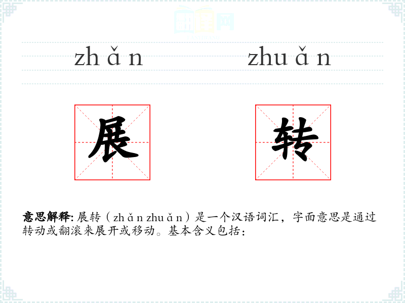 展转(zhǎn zhuǎn)是一个汉语词汇,字面意思是通过转动或翻滚来展开或移动。基本含义包括: