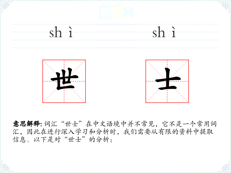 词汇“世士”在中文语境中并不常见,它不是一个常用词汇,因此在进行深入学*和分析时,我们需要从有限的资料中提取信息。以下是对“世士”的分析: