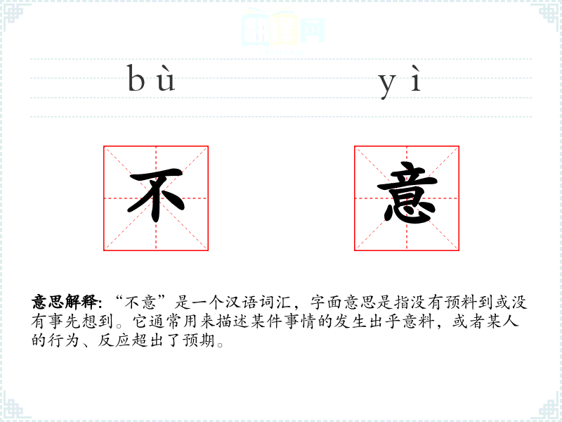 “不意”是一个汉语词汇,字面意思是指没有预料到或没有事先想到。它通常用来描述某件事情的发生出乎意料,或者某人的行为、反应超出了预期。