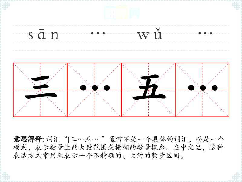 词汇“[三…五…]”通常不是一个具体的词汇,而是一个模式,表示数量上的大致范围或模糊的数量概念。在中文里,这种表达方式常用来表示一个不精确的、大约的数量区间。