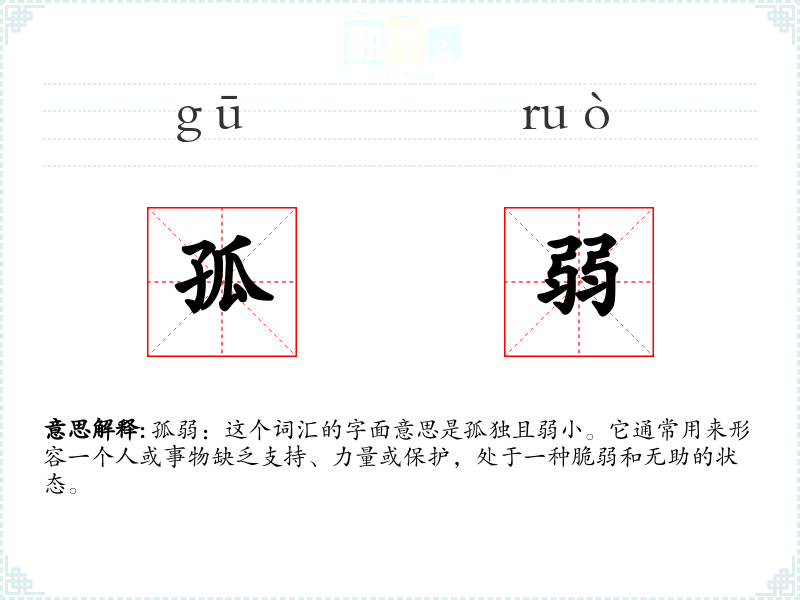 孤弱:这个词汇的字面意思是孤独且弱小。它通常用来形容一个人或事物缺乏支持、力量或保护,处于一种脆弱和无助的状态。