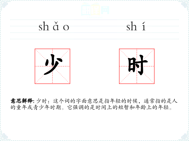 少时:这个词的字面意思是指年轻的时候,通常指的是人的童年或青少年时期。它强调的是时间上的短暂和年龄上的年轻。