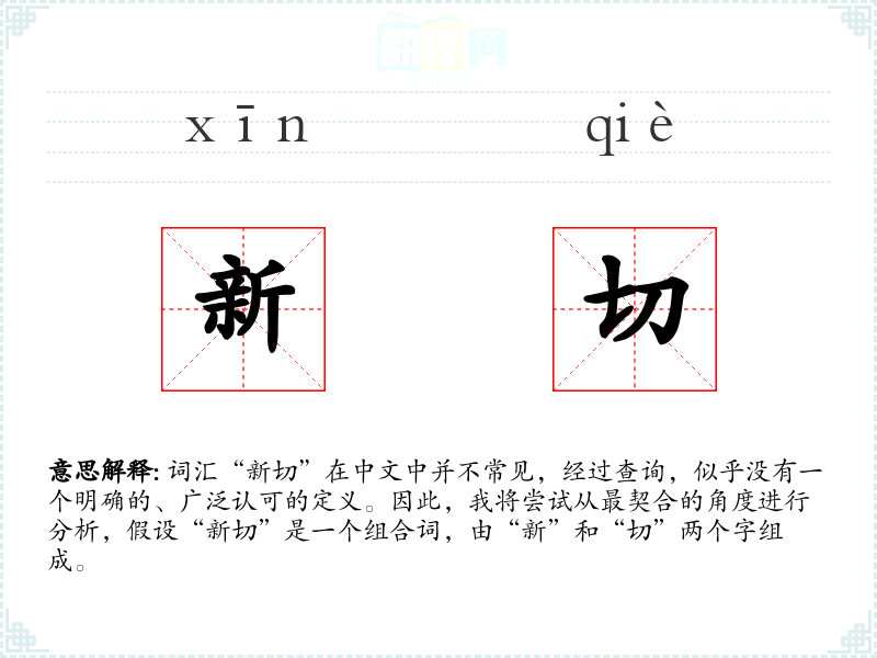 词汇“新切”在中文中并不常见,经过查询,似乎没有一个明确的、广泛认可的定义。因此,我将尝试从最契合的角度进行分析,假设“新切”是一个组合词,由“新”和“切”两个字组成。