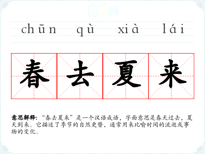 “春去夏来”是一个汉语成语,字面意思是春天过去,夏天到来。它描述了季节的自然更替,通常用来比喻时间的流逝或事物的变化。