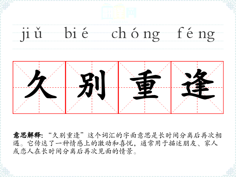 “久别重逢”这个词汇的字面意思是长时间分离后再次相遇。它传达了一种情感上的激动和喜悦,通常用于描述朋友、家人或恋人在长时间分离后再次见面的情景。