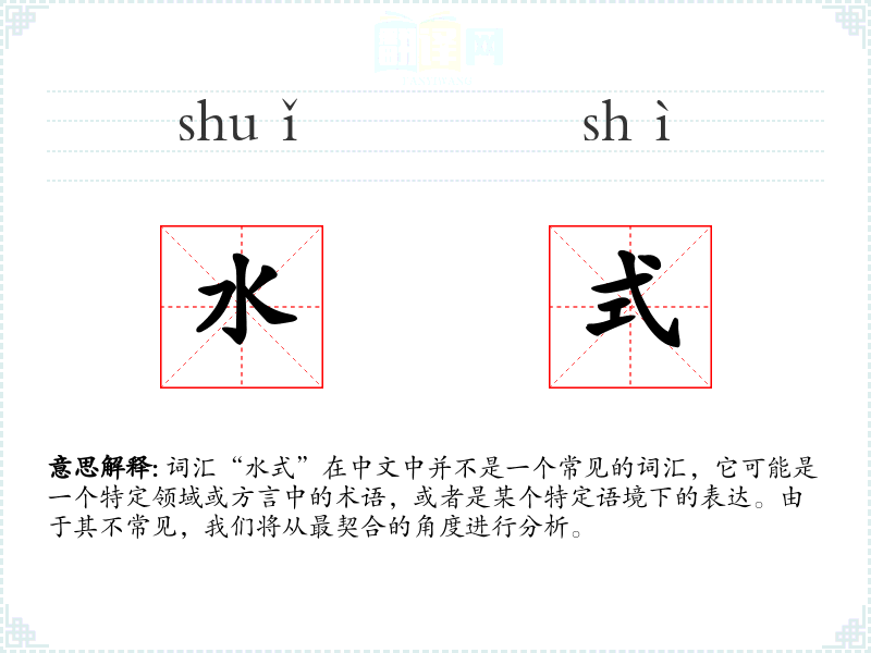 词汇“水式”在中文中并不是一个常见的词汇,它可能是一个特定领域或方言中的术语,或者是某个特定语境下的表达。由于其不常见,我们将从最契合的角度进行分析。