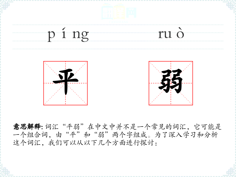 词汇“平弱”在中文中并不是一个常见的词汇,它可能是一个组合词,由“平”和“弱”两个字组成。为了深入学习和分析这个词汇,我们可以从以下几个方面进行探讨: