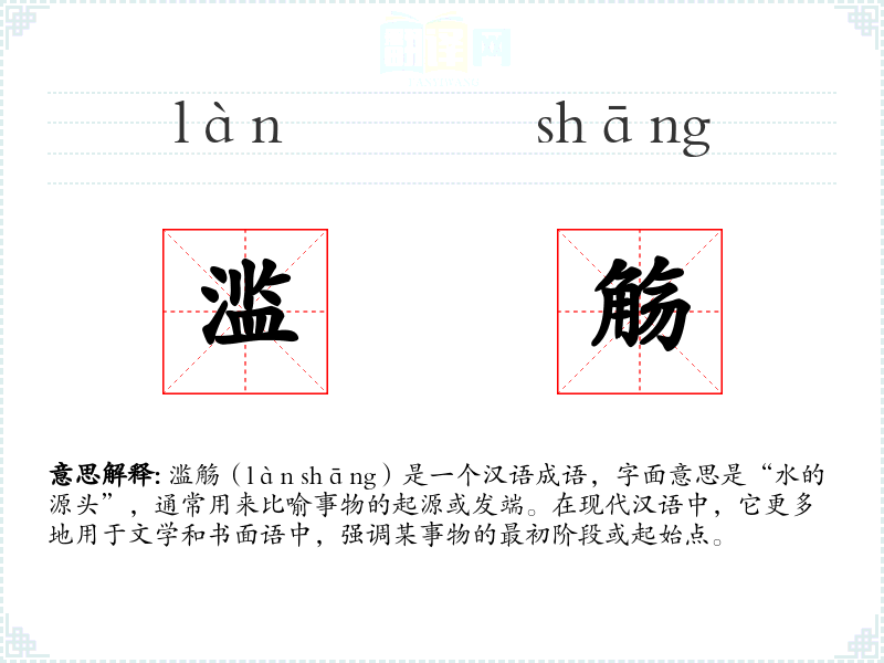 滥觞(làn shāng)是一个汉语成语,字面意思是“水的源头”,通常用来比喻事物的起源或发端。在现代汉语中,它更多地用于文学和书面语中,强调某事物的最初阶段或起始点。