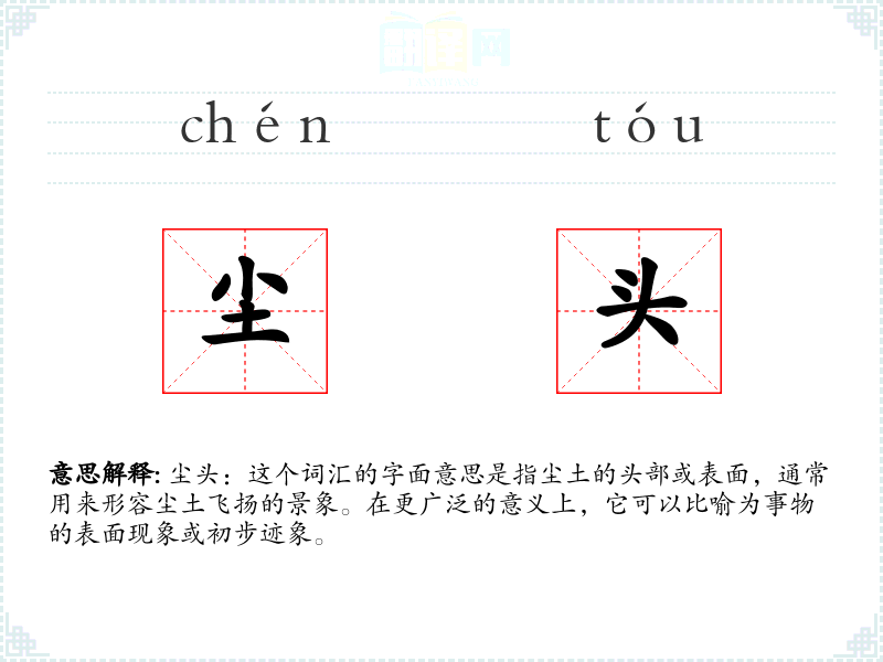 尘头:这个词汇的字面意思是指尘土的头部或表面,通常用来形容尘土飞扬的景象。在更广泛的意义上,它可以比喻为事物的表面现象或初步迹象。