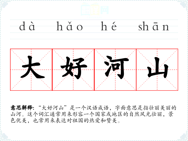 “大好河山”是一个汉语成语,字面意思是指壮丽美丽的山河。这个词汇通常用来形容一个国家或地区的自然风光壮丽,景色优美,也常用来表达对祖国的热爱和赞美。