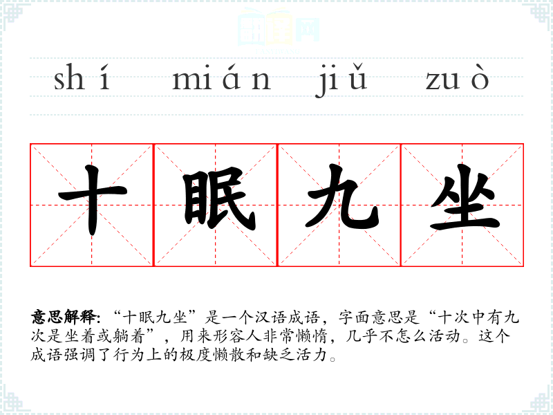 “十眠九坐”是一个汉语成语,字面意思是“十次中有九次是坐着或躺着”,用来形容人非常懒惰,几乎不怎么活动。这个成语强调了行为上的极度懒散和缺乏活力。