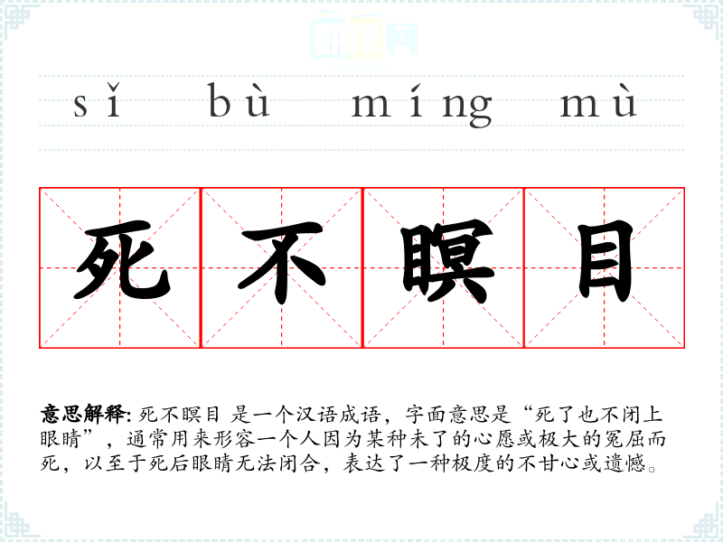 “死不瞑目”这个成语源自古代对死亡的一种描述,古人认为人死后眼睛闭合是正常现象,如果眼睛不闭合,则说明死者有心愿未了或有冤屈。随着时间的推移,这个词汇被广泛用于文学和日常语言中,表达更深层次的情感和意义。