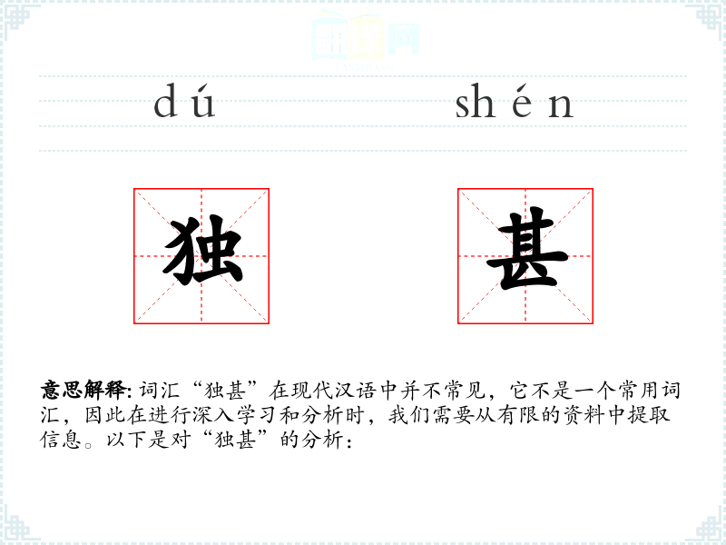 “独”字在汉语中有着悠久的历史,意为单独、独自。“甚”字意为非常、极其。两者结合的“独甚”可能在古代文献中有所使用,但随着语言的发展,这个词汇逐渐被其他更常用的表达所取代。