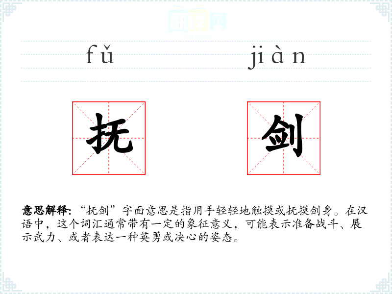 “抚剑”字面意思是指用手轻轻地触摸或抚摸剑身。在汉语中,这个词汇通常带有一定的象征意义,可能表示准备战斗、展示武力、或者表达一种英勇或决心的姿态。