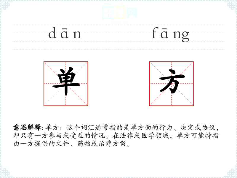 单方:这个词汇通常指的是单方面的行为、决定或协议,即只有一方参与或受益的情况。在法律或医学领域,单方可能特指由一方提供的文件、药物或治疗方案。