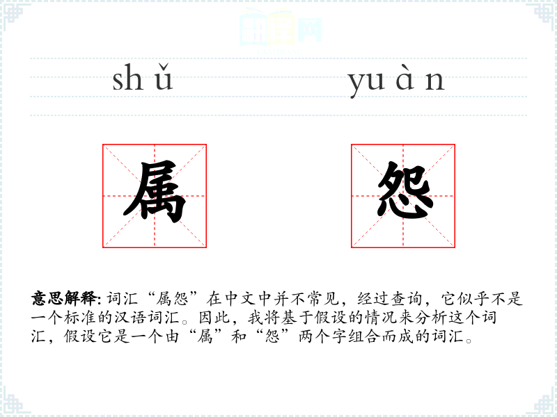 词汇“属怨”在中文中并不常见,经过查询,它似乎不是一个标准的汉语词汇。因此,我将基于假设的情况来分析这个词汇,假设它是一个由“属”和“怨”两个字组合而成的词汇。