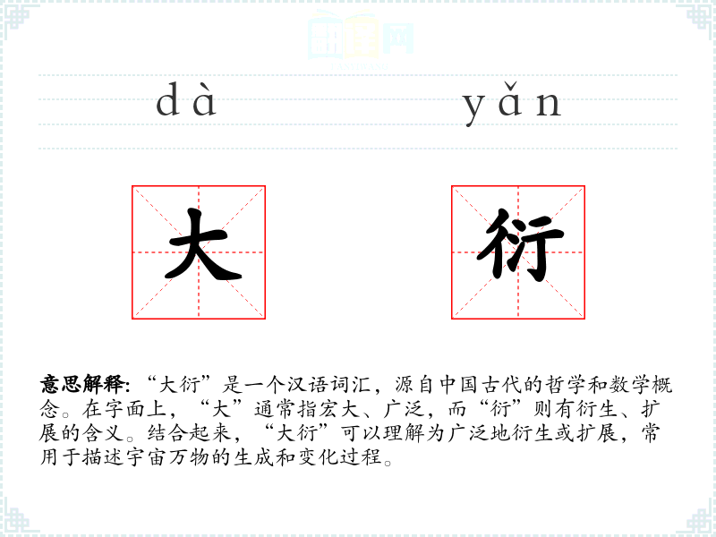 - 在数学理论中,“大衍”被用来描述一种广泛的衍生和变化模式。