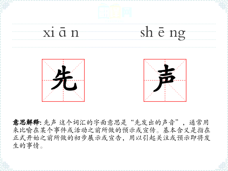 “先声”一词源自汉语,由“先”和“声”两个字组成。在古代汉语中,“先声”常用于军事或政治语境,指先行发出的信号或声音。随着时间的推移,其使用范围扩大,现在可以用于各种预示性的语境。