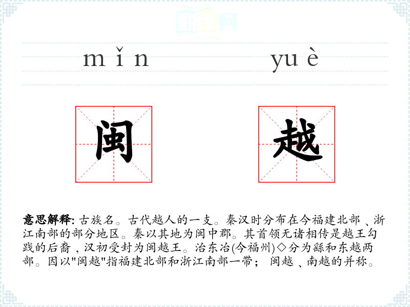1.古族名。古代越人的一支。秦汉时分布在今福建北部﹑浙江南部的部分地区。秦以其地为闽中郡。其首领无诸相传是越王勾践的后裔﹐汉初受封为闽越王。治东冶(今福州)◇分为繇和东越两部。因以"闽越"指福建北部和浙江南部一带; 闽越﹑南越的并称。