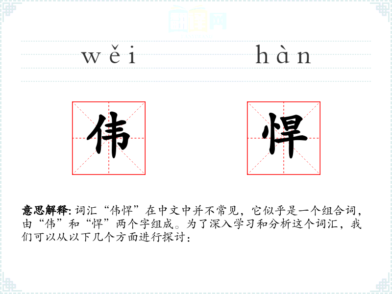 词汇“伟悍”在中文中并不常见,它似乎是一个组合词,由“伟”和“悍”两个字组成。为了深入学习和分析这个词汇,我们可以从以下几个方面进行探讨: