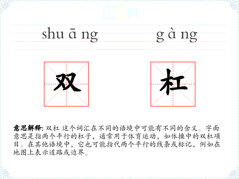 "双杠"的意思解释、双杠是什么意思由翻译网汉语词典查词提供。