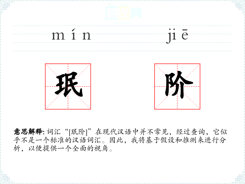 词汇“[珉阶]”在现代汉语中并不常见,经过查询,它似乎不是一个标准的汉语词汇。因此,我将基于假设和推测来进行分析,以便提供一个全面的视角。