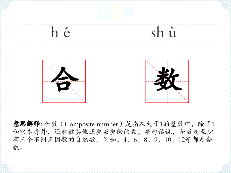 - 反义词:质数(Prime number),指只能被1和自身整除的数。