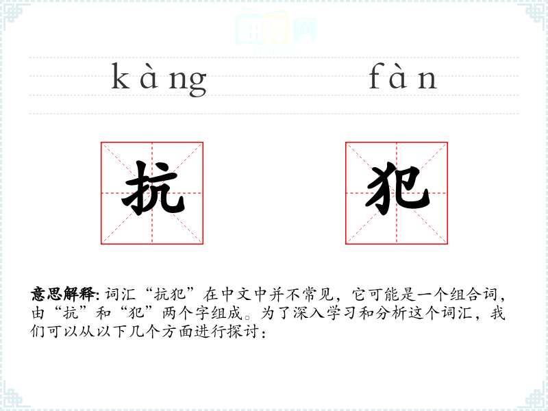 词汇“抗犯”在中文中并不常见,它可能是一个组合词,由“抗”和“犯”两个字组成。为了深入学习和分析这个词汇,我们可以从以下几个方面进行探讨: