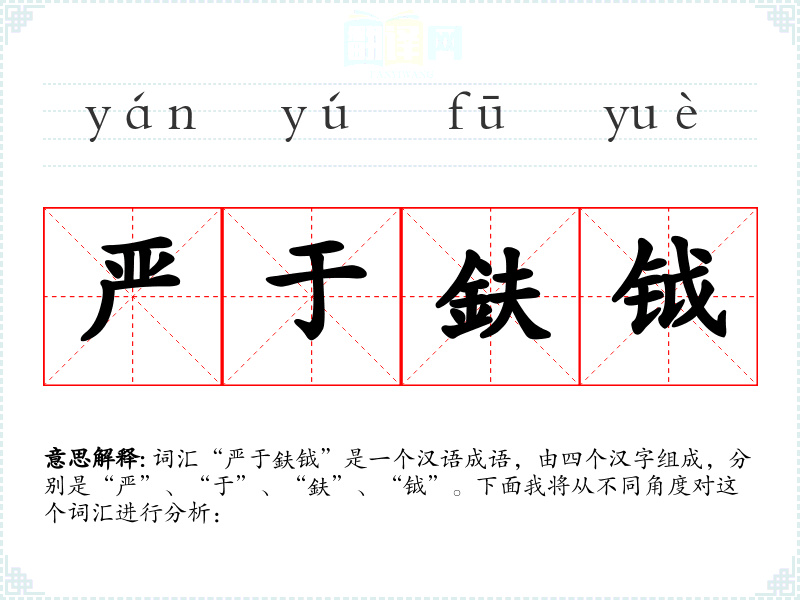 - 字面意思:“严”表示严格、严厉;“于”是一个介词,表示在某个方面;“鈇”是一种古代的刑具,类似于斧头;“钺”也是一种古代的兵器,形状类似大斧。
