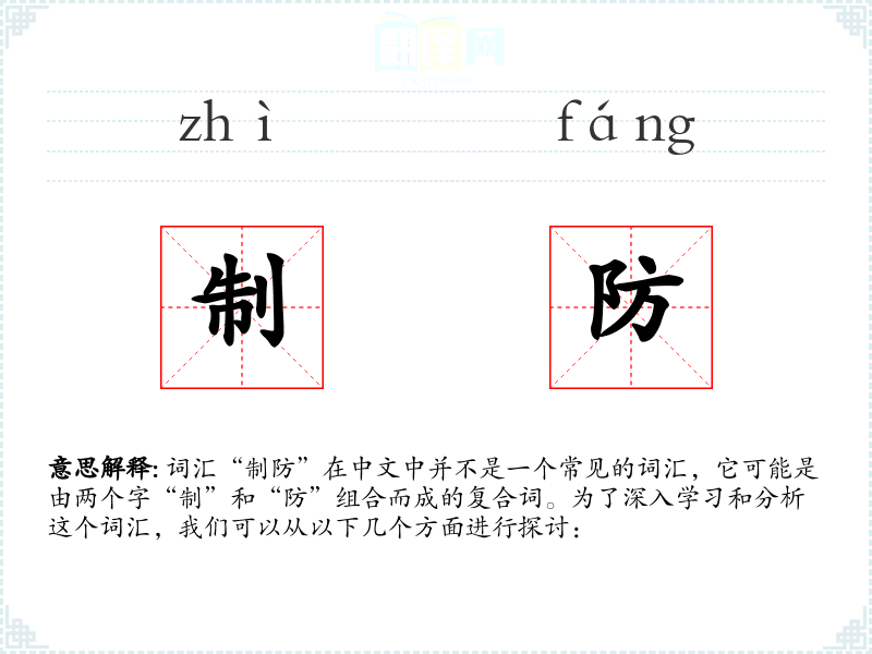 词汇“制防”在中文中并不是一个常见的词汇,它可能是由两个字“制”和“防”组合而成的复合词。为了深入学*和分析这个词汇,我们可以从以下几个方面进行探讨: