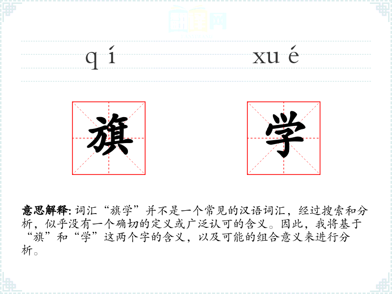 词汇“旗学”并不是一个常见的汉语词汇,经过搜索和分析,似乎没有一个确切的定义或广泛认可的含义。因此,我将基于“旗”和“学”这两个字的含义,以及可能的组合意义来进行分析。