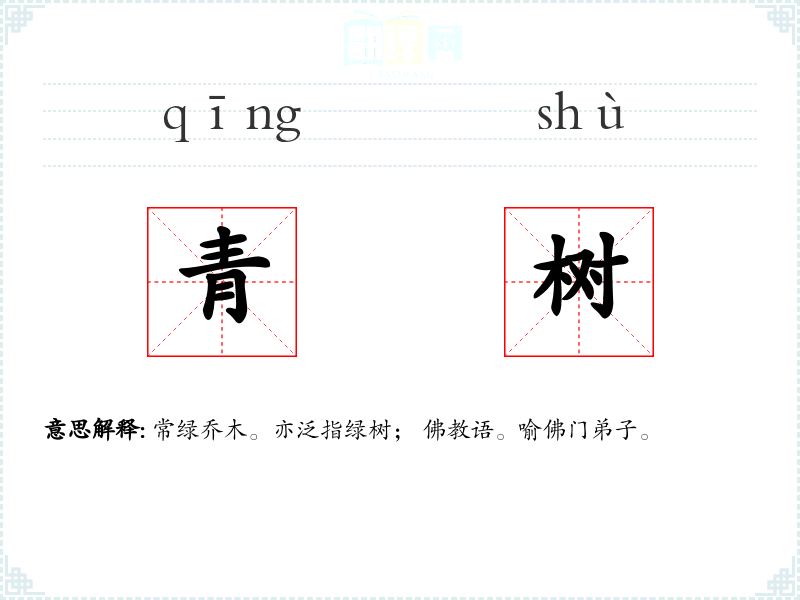 常绿乔木。亦泛指绿树; 佛教语。喻佛门弟子。