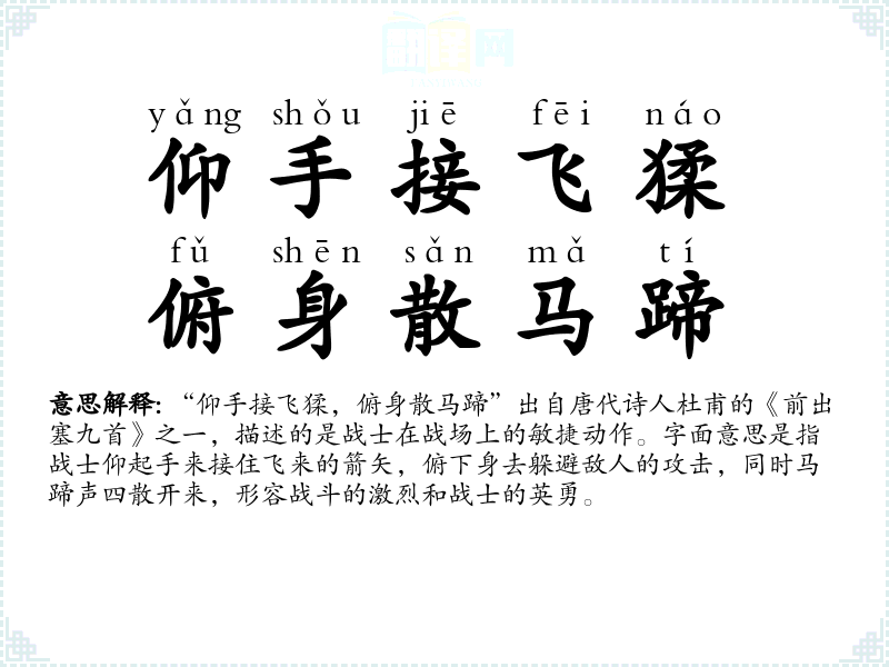 “仰手接飞猱,俯身散马蹄”出自唐代诗人杜甫的《前出塞九首》之一,描述的是战士在战场上的敏捷动作。字面意思是指战士仰起手来接住飞来的箭矢,俯下身去躲避敌人的攻击,同时马蹄声四散开来,形容战斗的激烈和战士的英勇。