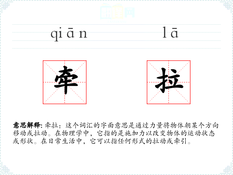 - 口语:在日常对话中,“牵拉”可能简单地指物理动作,如“请帮我牵拉一下这个箱子”。