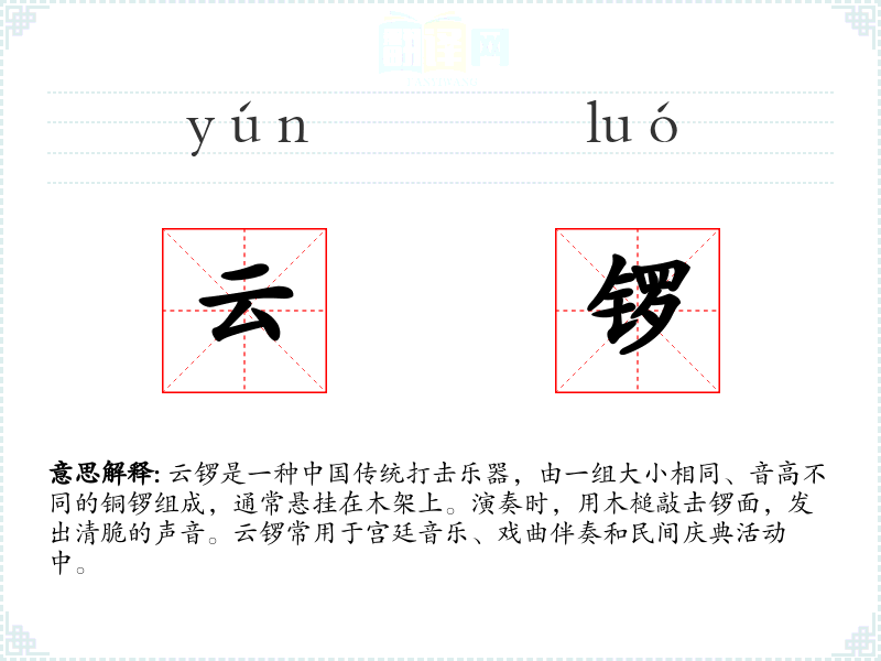 云锣不仅是一种乐器,更是*传统文化的象征。了解和欣赏云锣,有助于我们更好地理解和传承中华文化。在语言学和表达中,正确使用云锣这一词汇,可以丰富我们的文化知识和语言表达能力。