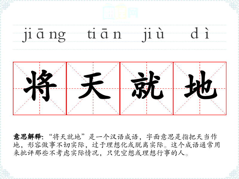 “将天就地”是一个汉语成语,字面意思是指把天当作地,形容做事不切实际,过于理想化或脱离实际。这个成语通常用来批评那些不考虑实际情况,只凭空想或理想行事的人。