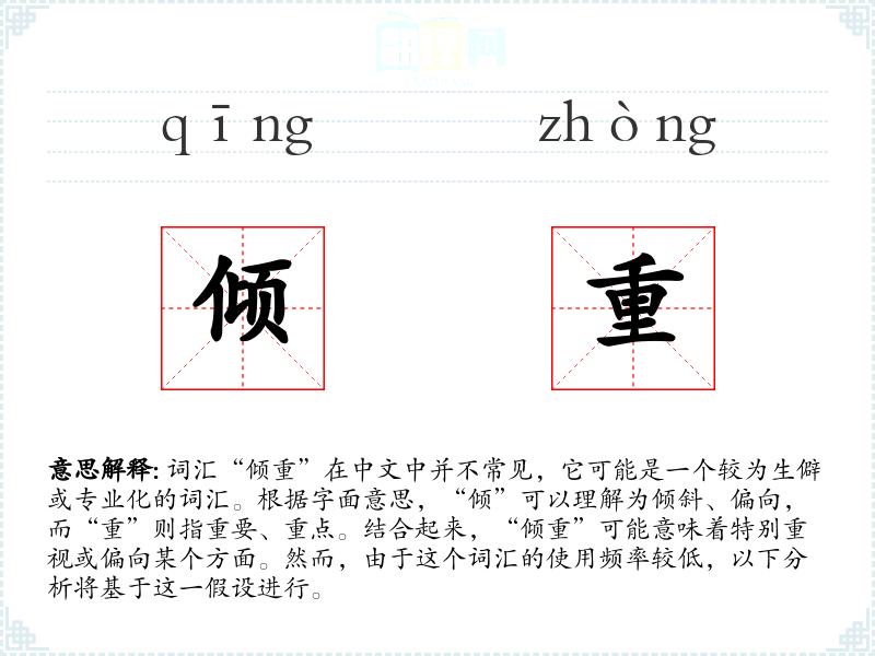词汇“倾重”在中文中并不常见,它可能是一个较为生僻或专业化的词汇。根据字面意思,“倾”可以理解为倾斜、偏向,而“重”则指重要、重点。结合起来,“倾重”可能意味着特别重视或偏向某个方面。然而,由于这个词汇的使用频率较低,以下分析将基于这一假设进行。