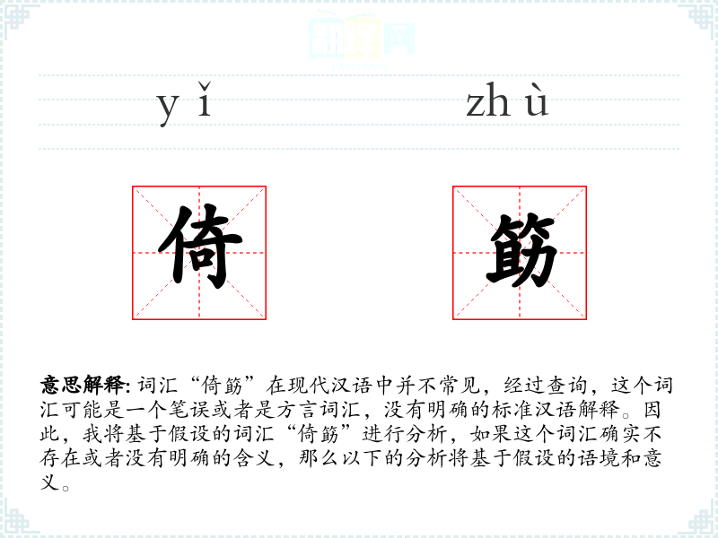 词汇“倚筯”在现代汉语中并不常见,经过查询,这个词汇可能是一个笔误或者是方言词汇,没有明确的标准汉语解释。因此,我将基于假设的词汇“倚筯”进行分析,如果这个词汇确实不存在或者没有明确的含义,那么以下的分析将基于假设的语境和意义。