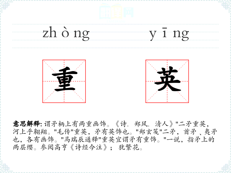 谓矛柄上有两重画饰。《诗.郑风.清人》"二矛重英,河上乎翱翔。"毛传"重英,矛有英饰也。"郑玄笺"二矛,酋矛﹑夷矛也,各有画饰。"马瑞辰通释"重英宜谓矛有重饰。"一说,指矛上的两层缨。参阅高亨《诗经今注》; 犹繁花。
