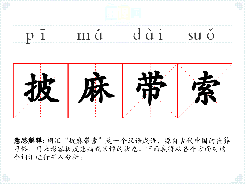 词汇“披麻带索”是一个汉语成语,源自古代*的丧葬俗,用来形容极度悲痛或哀悼的状态。下面我将从各个方面对这个词汇进行深入分析: